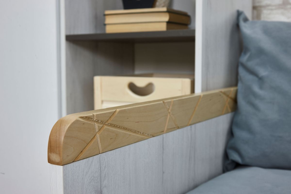 Подлокотники кроватей, мебельные ручки, полки кубы выполнены из массива березы.