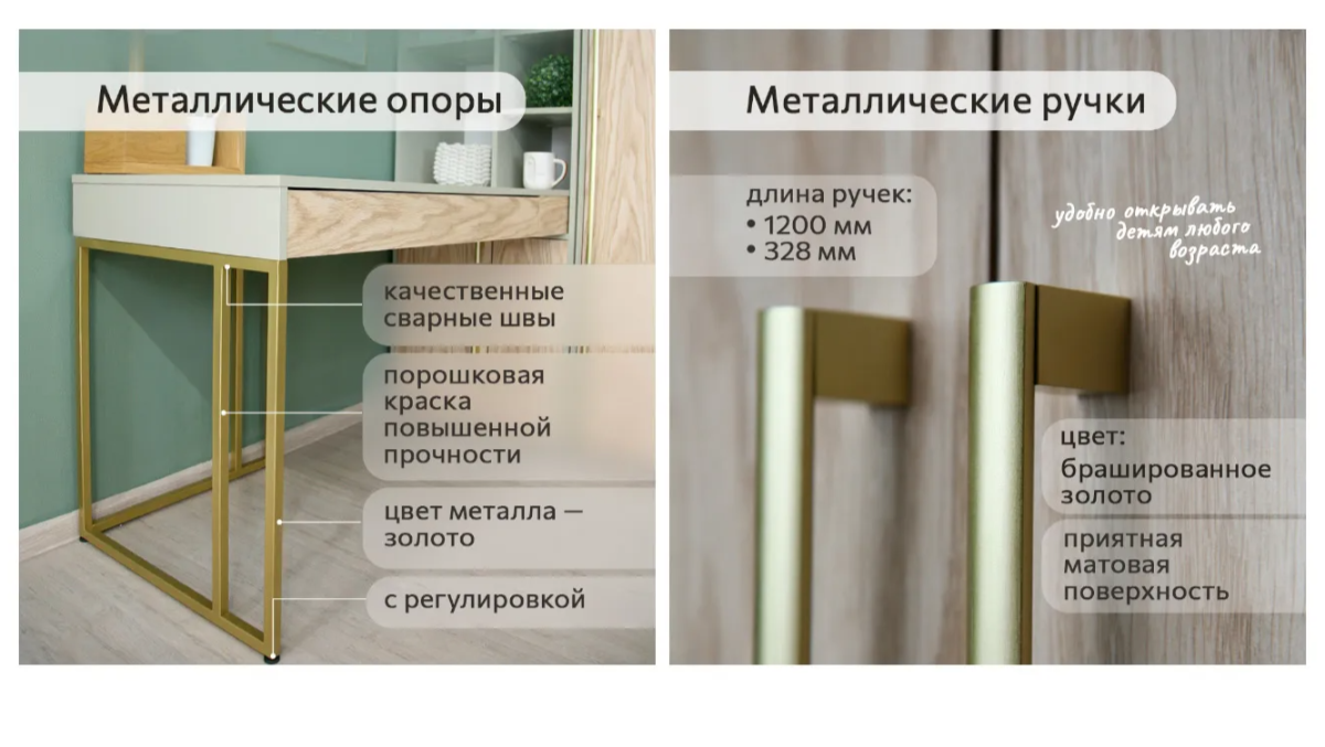 • Графическая изюминка: длинные, строгие металлические ручки в двух эффектных расцветках – золото и графит, напоминают стройный, грациозный образ журавля.