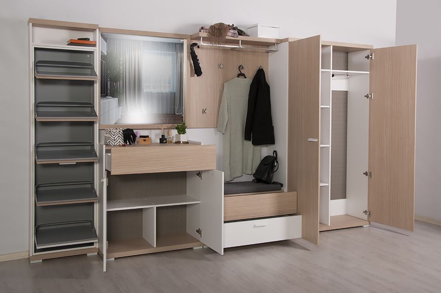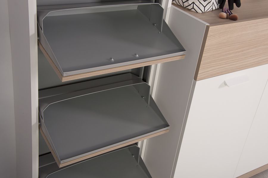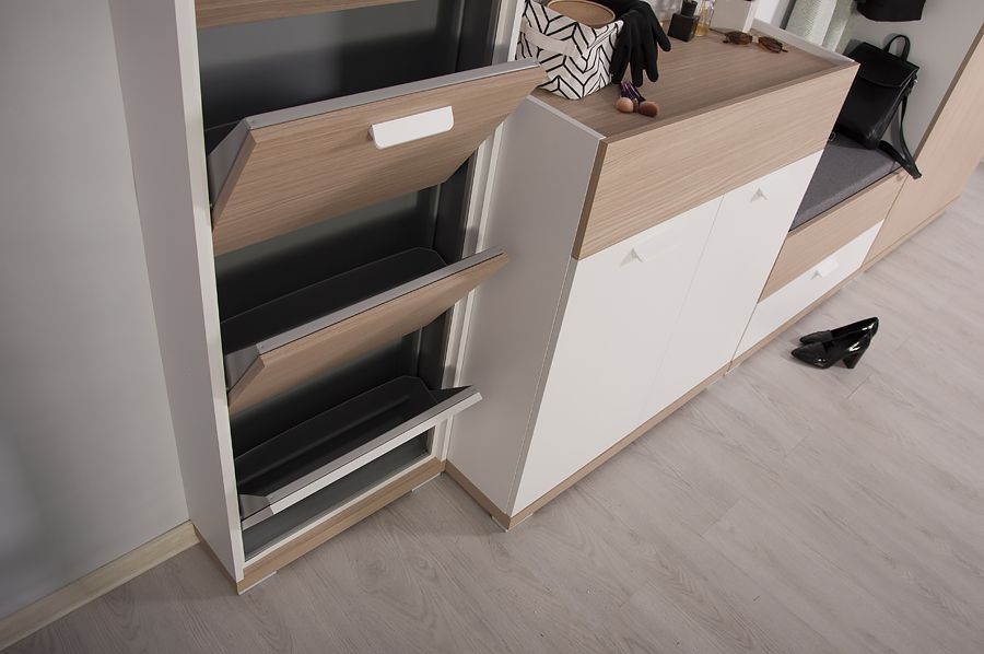 Обувница Оливия - удобная высокая обувница с синхронным открытием лотков из оцинкованного металла с полимерным покрытием легка в эксплуатации и удовлетворяет требованиям гигиены.