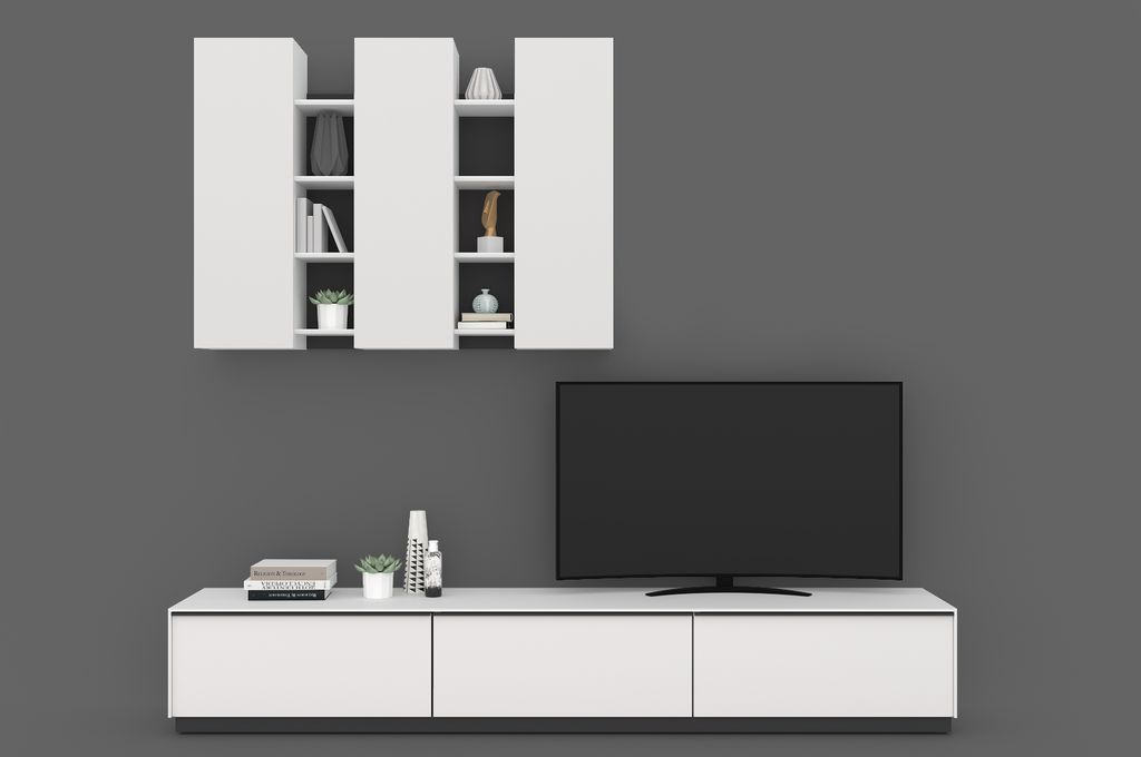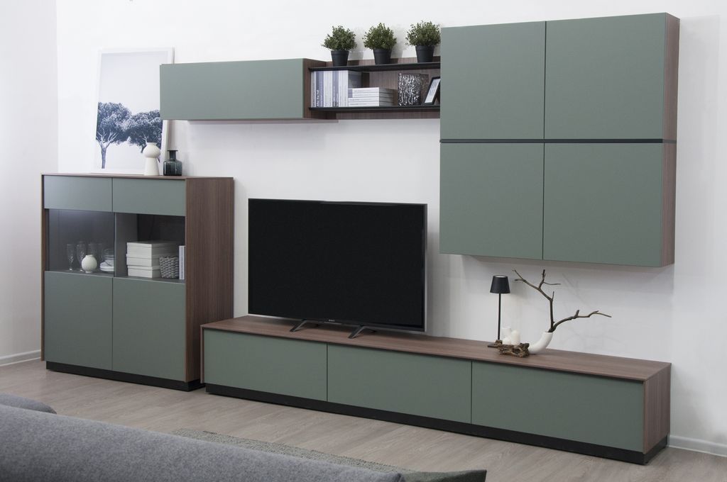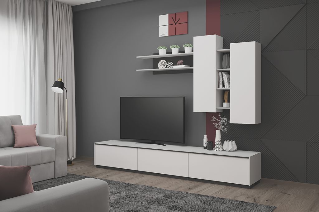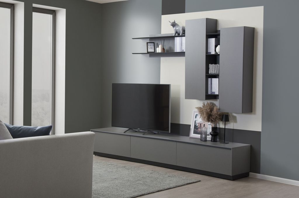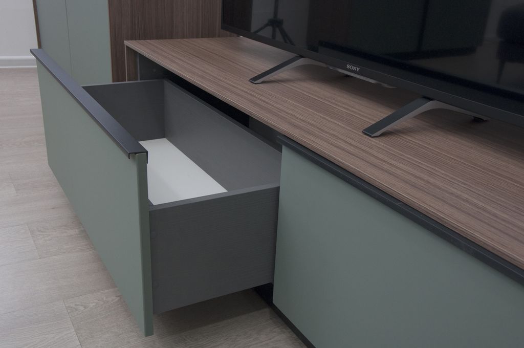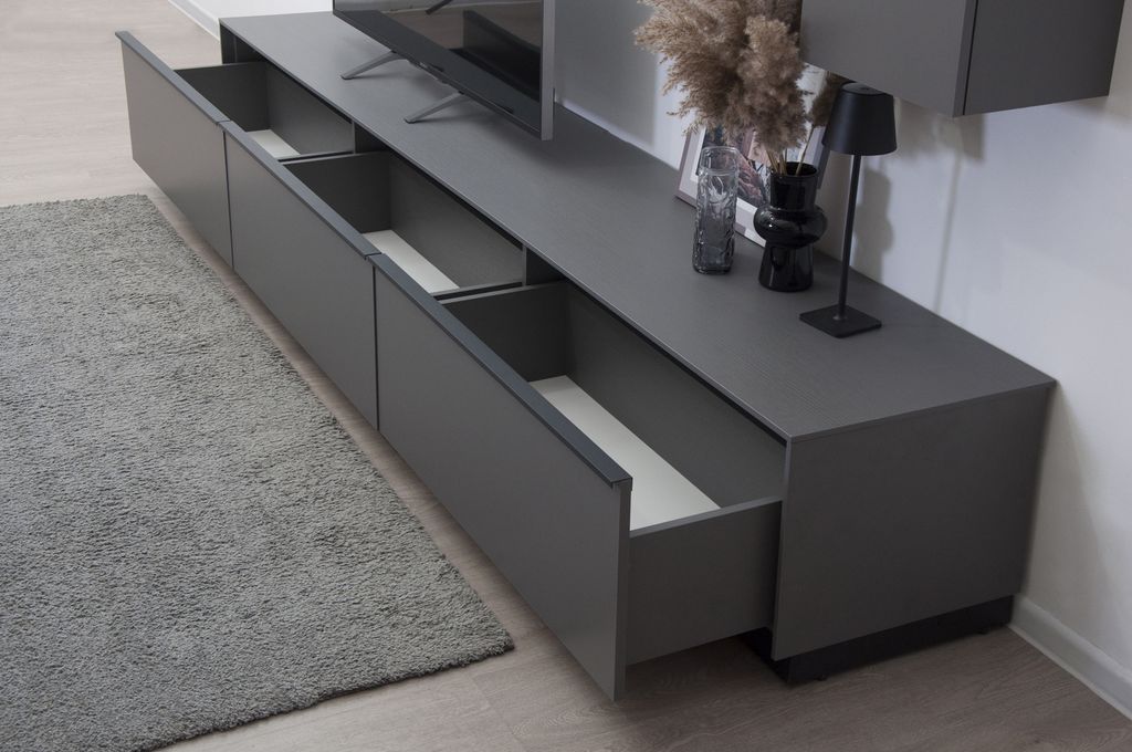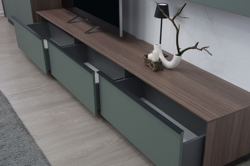 Низкая ТВ-тумба с тремя ящиками - элемент модульной системы для гостиной в стиле минимализм.