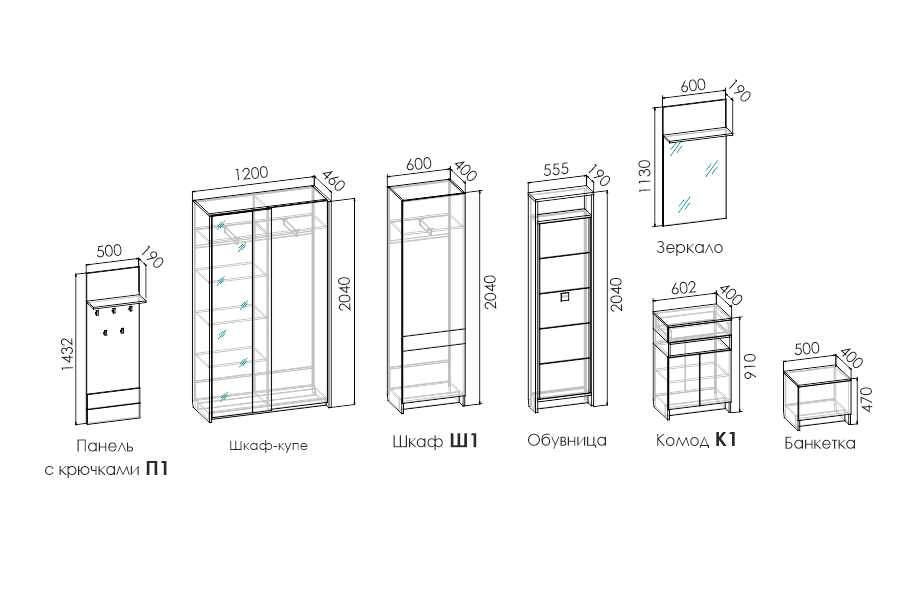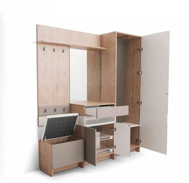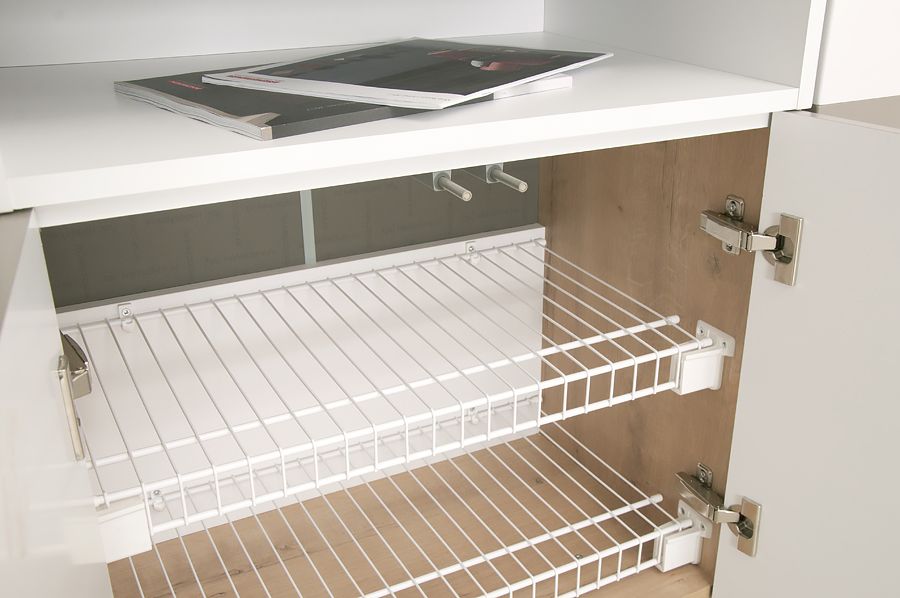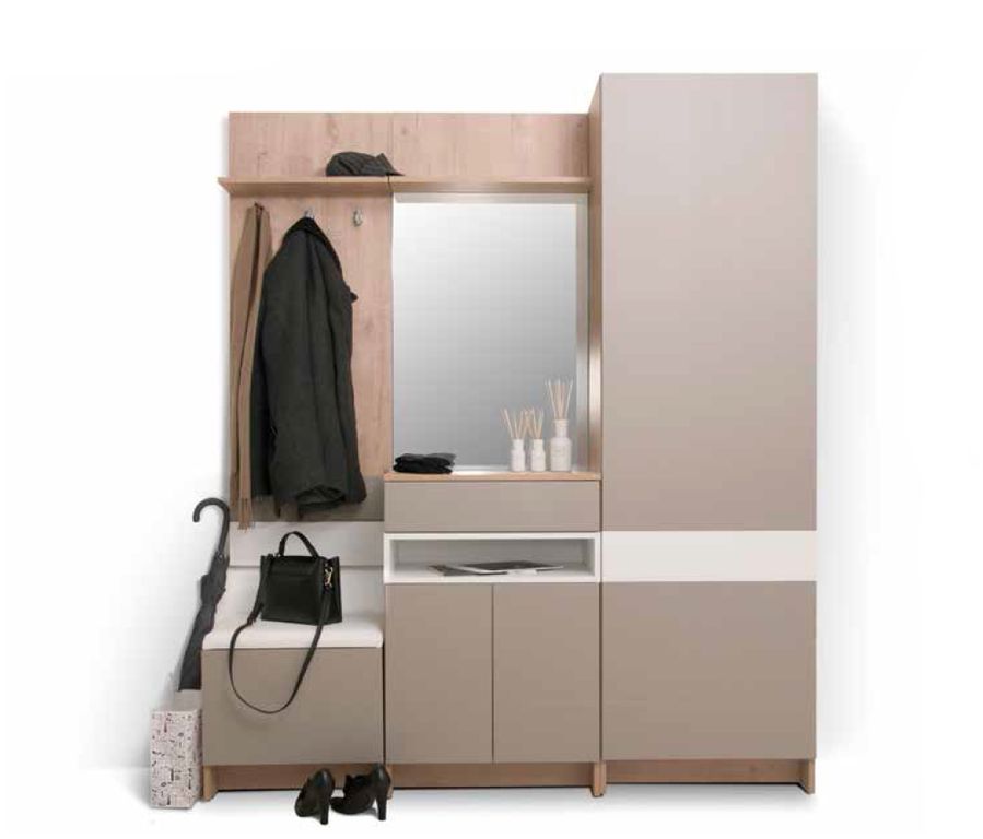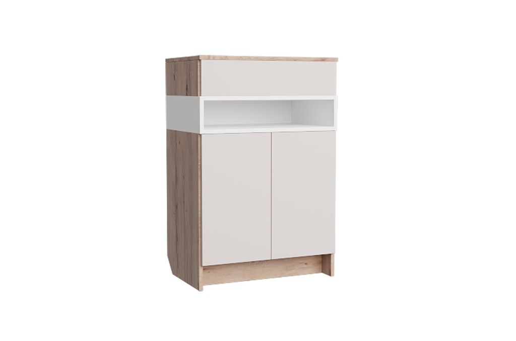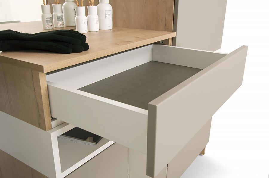 Тумба Руна Т1 - стильная функциональная тумба для прихожей скомпонована из небольшого выдвижного ящика для мелочей, ниши и отделения с двумя решетчатыми металлическими полками для обуви за двумя распашными дверцами. Выдвижной ящик оснащен скрытыми направляющими, распашные дверцы - петлями быстрого монтажа и системой открывания без ручек.