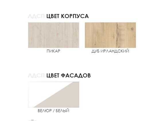 Корпус изготовлен из ЛДСП 22, 16 мм в тонировке дуб ирландский/белый или пикар/белый, а фасады - из МДФ 16 мм в тонировке грей и белый крап.